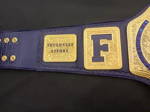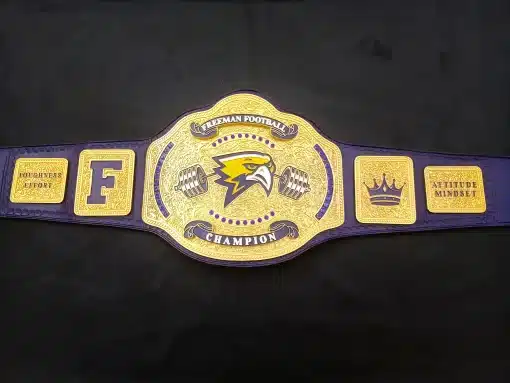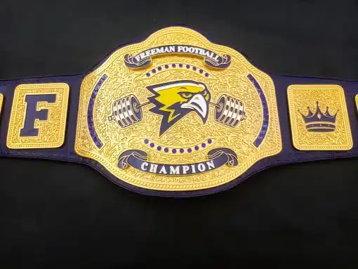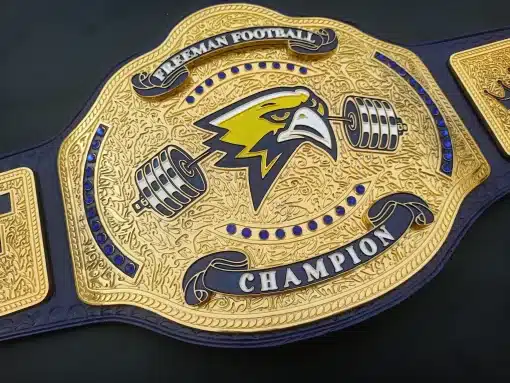 The Freeman Football Championship Belt is a professionally crafted title belt originally designed for Freeman High School Football – Golden Eagles (@fhsgoldfootball). This belt can be customized with your school’s logo, text, and colors, or redesigned entirely from scratch to create a one-of-a-kind championship belt for your program.